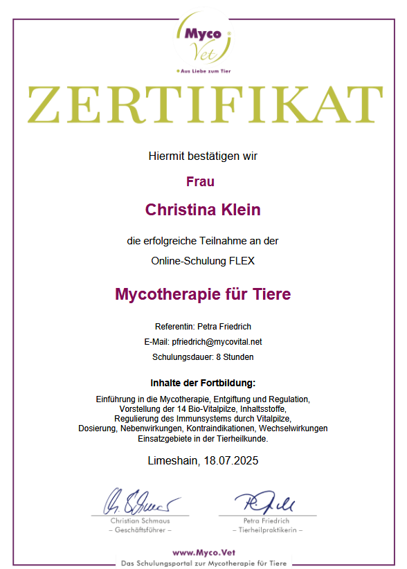 7/25 Weiterbildung Vitalpilze bei Mycovital 8/25 Blutegel-Kurs bei Tierheilpraxis Fuchs